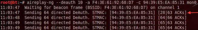 - aireplay-ng --deauth [패킷 전송 횟수] -a [타겟 무선AP의 BSSID] -c [타겟 Station의 MAC 주소) mon?