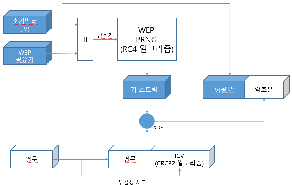- 무작위(랜덤)로 생성하는 24bit 초기 벡터(IV) + 고정된 40bit(WEP-40) 또는 104bit(WEP-104)의 공유키를 조합하여 WEP 암호키 생성