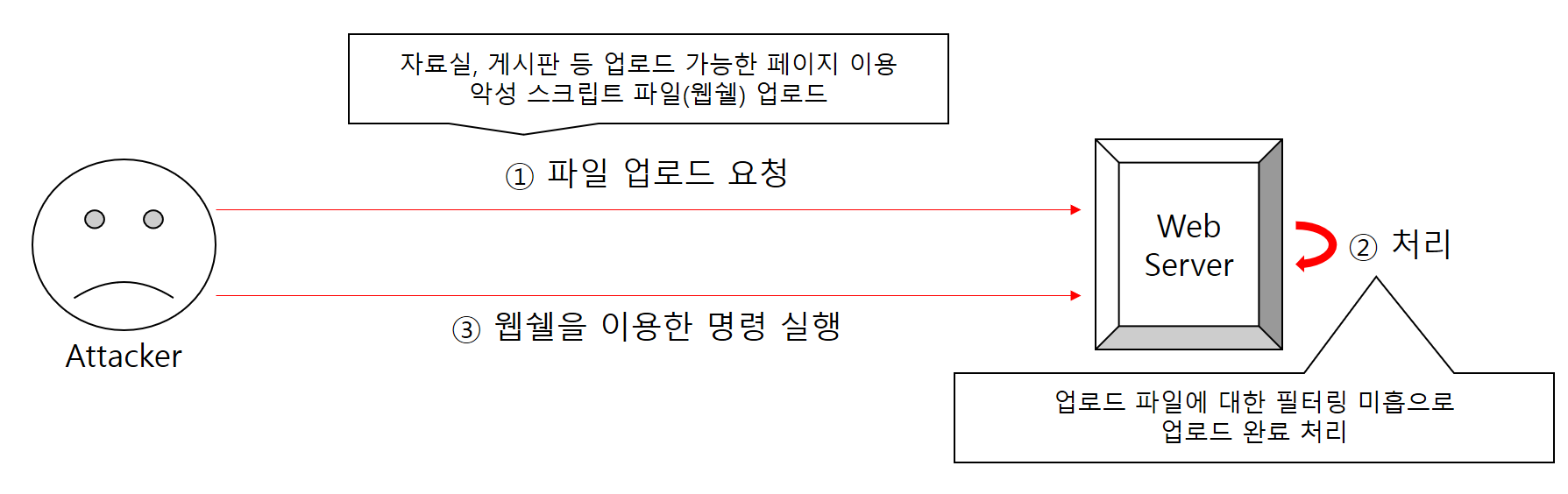 - 악성 웹쉘(다양한 언어로 만들며, 임의의 명령을 실행할 수 있는 Server Side Script 파일) 업로드