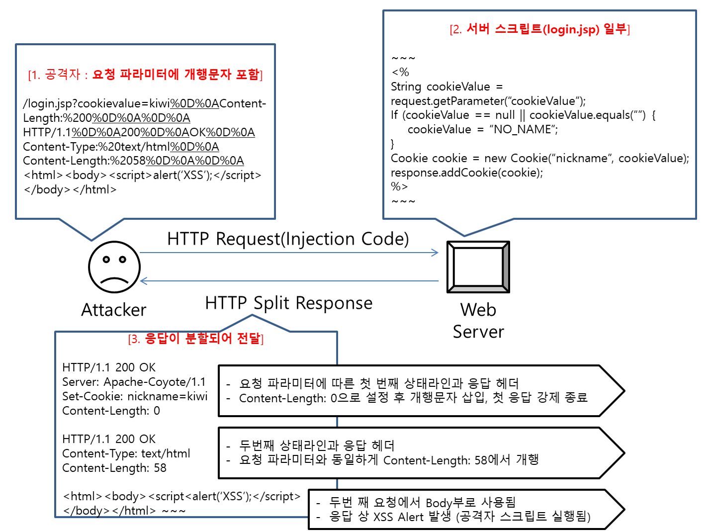 * HTTP 응답 분할 취약점 : Client의 HTTP 요청 파라미터(입력)값에 개행문자(CR. LF)가 포함되어 있을 때, HTTP 응답이 2개 이상으로 분리될 수 있으며, 이에 따라 공격자가 첫 응답을 종료시킨 후, 이후 응답에 악의적 코드를 삽입, 실행 할 수 있는 취약점