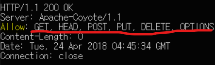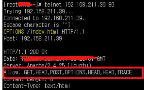 * 지원하는 메소드 확인 (Telnet 사용) : telnet을 통해 서비스 IP 및 Port에 접근 후, OPTIONS 메소드(지원할 시)로 Allow 헤더 필드로 지원하는 메소드 리스트 확인이 가능