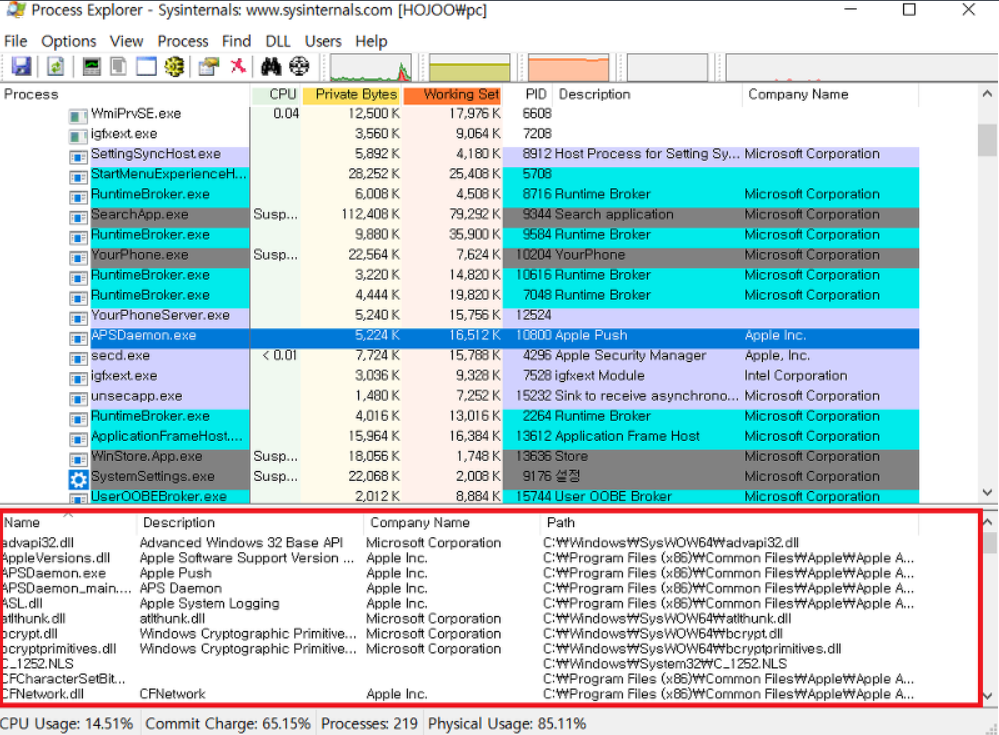 3) 특정 프로세스의 Handle 및 DLL 정보 참조 (View -> Lower Pane View에서 선택 -> Show Lower Pane)