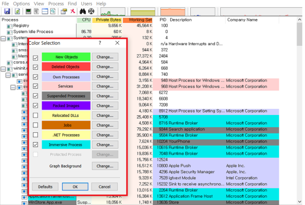 | Own Processes | * Process Explorer와 동일 사용자의 계정으로 실행된 프로세스 |