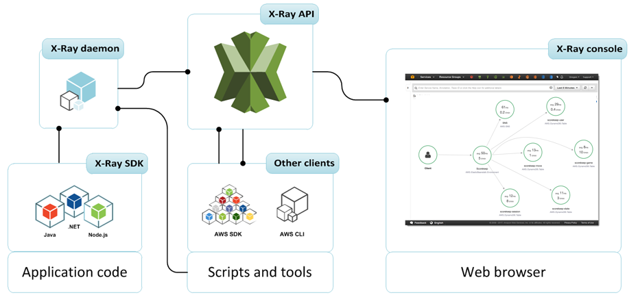 * AWS X-Ray : 개발자를 위한 일종의 애플리케이션 분석 및 디버깅 서비스로, 애플리케이션의 구성(최근엔 분산 마이크로서비스 등 복잡한 형태)을 시각화 한 맵으로 표현해주는 서비스