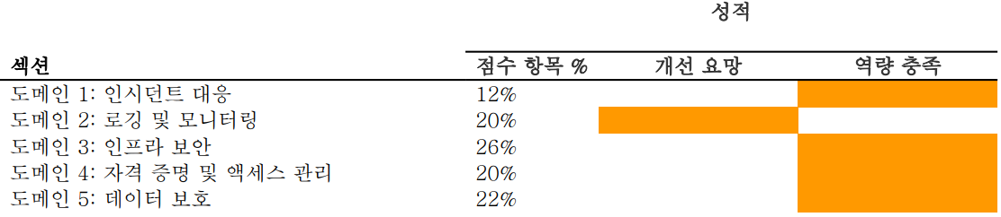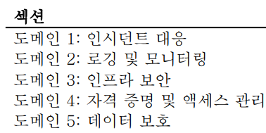 - 총 5개의 섹션으로 이미지 처럼 사고 대응, 로깅 및 모니터링, AWS 인프라 환경에서의 보안, 자격 증명 등의 관리와 데이터 보호로 분류