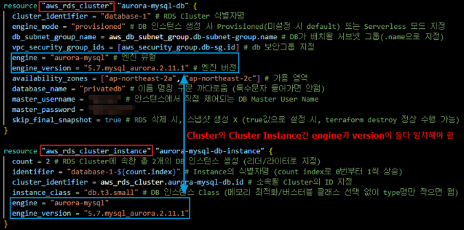 - RDS 생성 시, Cluster와 DB Instance간 지정하는 Engine과 Version의 정보가 모두 일치해야 생성 가능