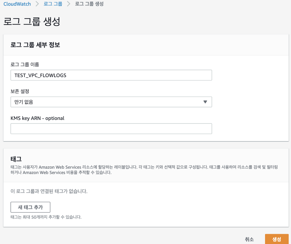1) VPC 생성 후 CloudWatch 로그 그룹 생성
