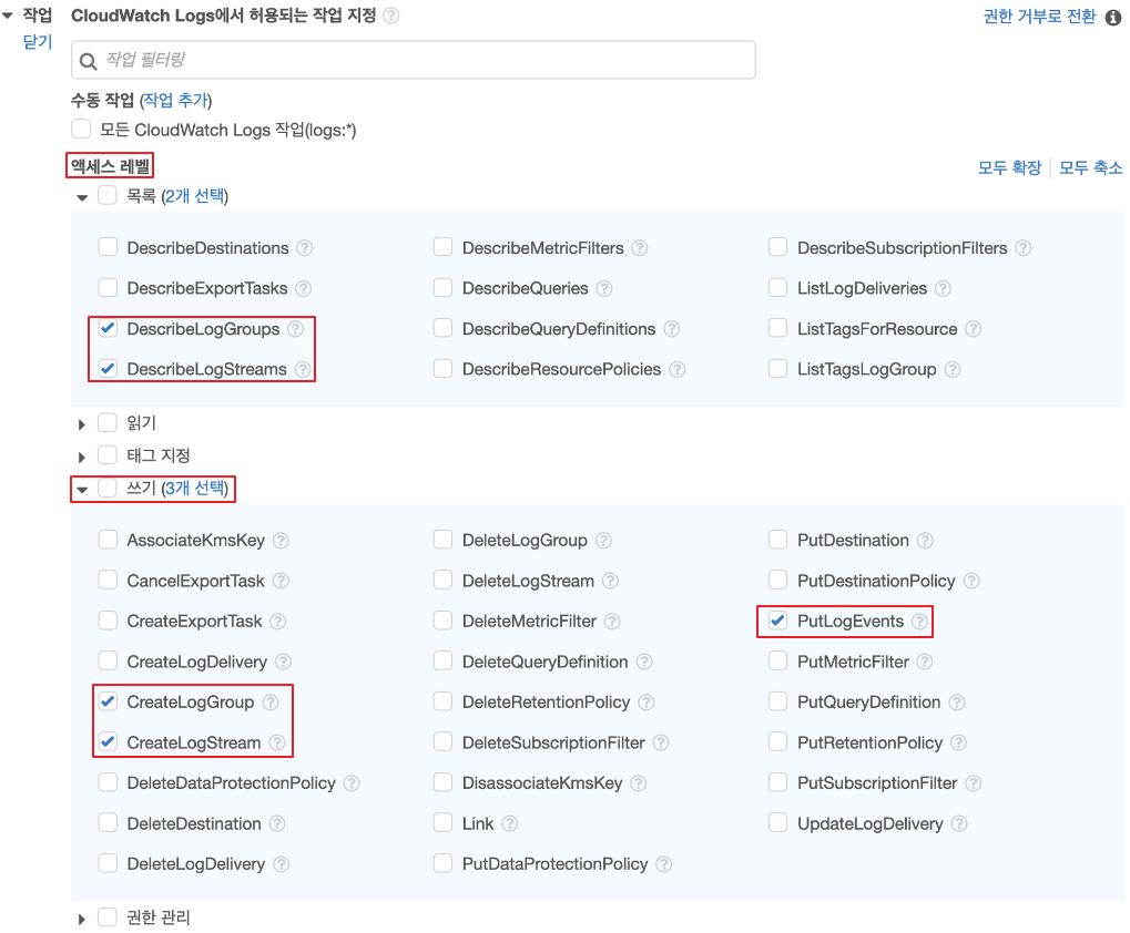 - Cloudwatch 정책 생성은 상단에 작성한 부분을 참조하여 생성