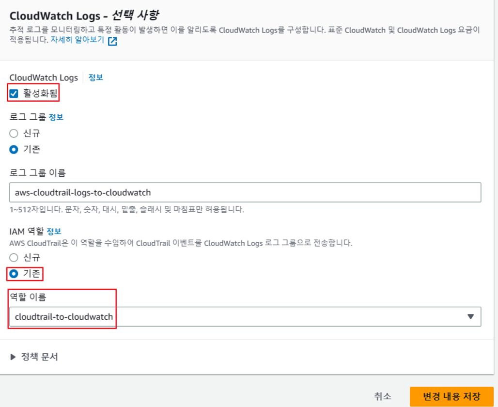 2) Cloudtrail 추적에서 CloudWatch logs 편집 설정