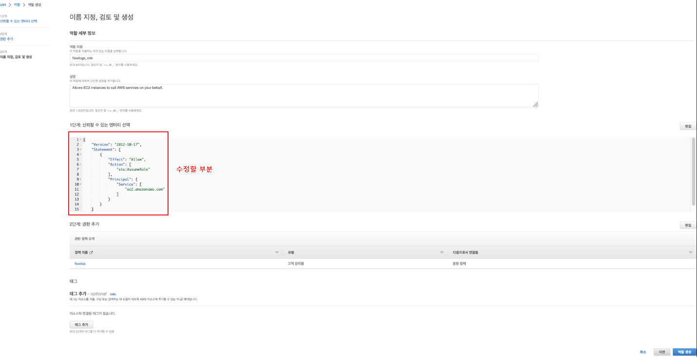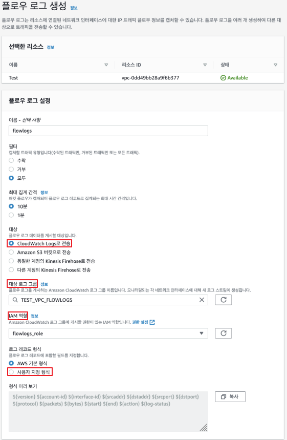 - IAM 역할 (2번에서 생성했던 vpc-flow-logs를 신뢰 관계로 설정한 IAM 역할 지정)