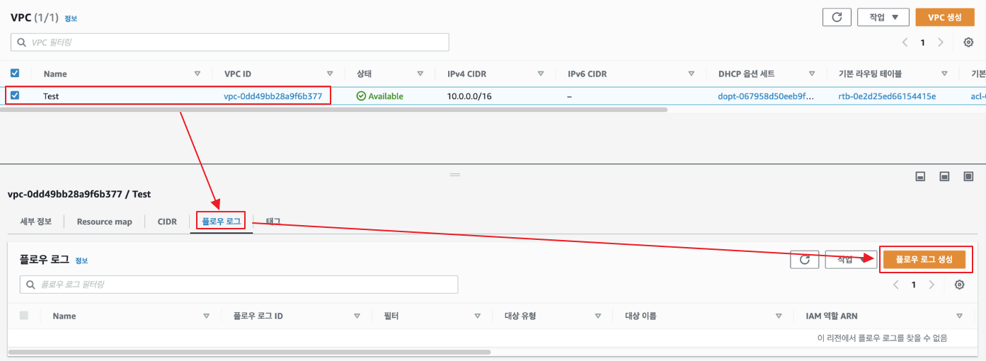 - CloudWatch와 별도의 VPC Flowlogs 생성 필요