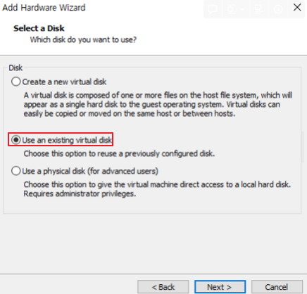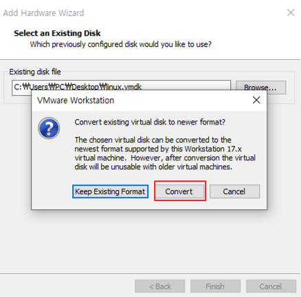 - 이후 해당 vmdk File을 VMWare의 New virtual Machine으로 추가