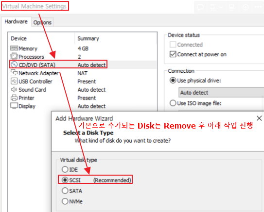 - ISO 추가 없이, 운영체제 유형만 적절히 지정 후, Default Disk Remove 후, 해당 vmdk 추가 작업 진행