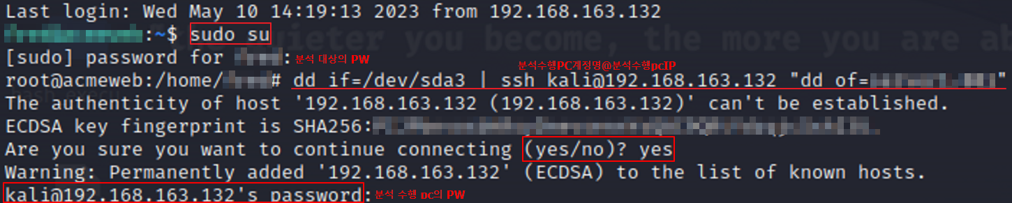 - ssh 접속 후, 분석 대상의 파티션을 dd(raw) format 이미지 -> 분석 수행 PC로 이동