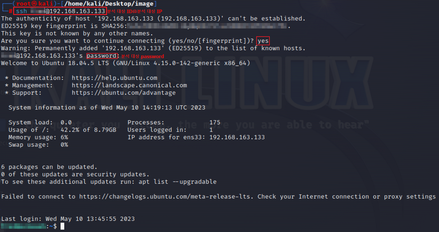 - 분석 수행 PC ssh -> 분석 대상으로 접속