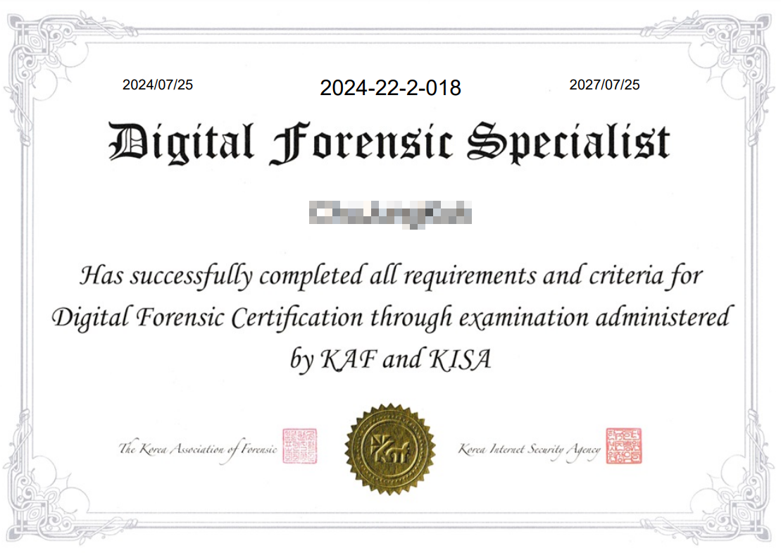 - 말그대로 디지털 증거물에 대한 법의학 시험으로 전자 기기 내의 디지털 증거물에 대한 탐색, 확보 등의 일련의 절차와 방식에 대해 이해한 상태로 직접 증거 탐색을 수행하는 시험이다.