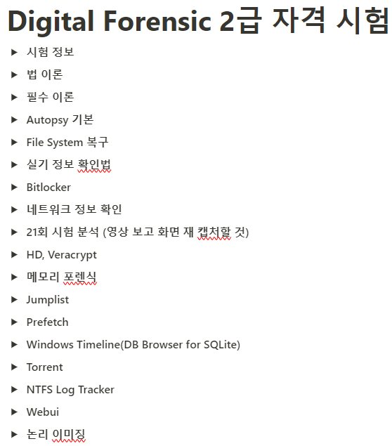 1. 유료 사이트 : 인프런_디지털포렌식 입문자를 위한 디지털포렌식 전문가 2급 실기 시험대비 강의(Encase/Autopsy) 2. 노션_빛낭님의 디지털 포렌식 학습 및 실습 자료 - 기초를 제대로 잡고 가지 않으면 해당 시험은 몇번을 보더라도 탈락할 게 뻔하기 때문에 유료 강의 하나와 추가 학습에 도움이 될 무료 사이트를 애용했다. |