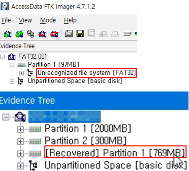 - 손상 또는 삭제된 파티션을 FTK Imager가 복구했음을 의미함