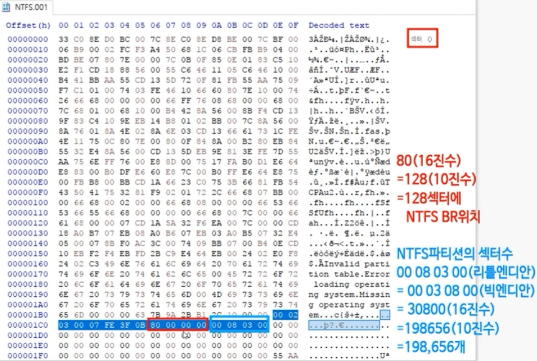 - 우선 MBR을 참조하여 NTFS 파티션 Sector 수를 확인 후, (NTFS 시작 Sector + 총 Sector 수 - 1)의 값으로 백업 BR이 존재하는 곳으로 이동함