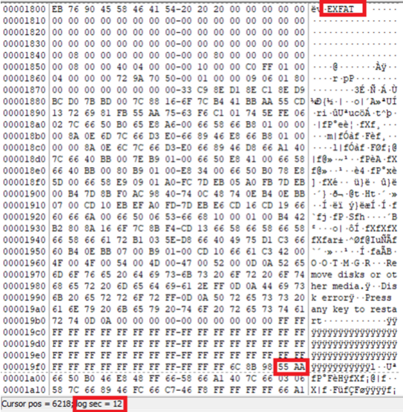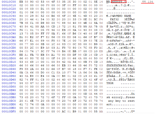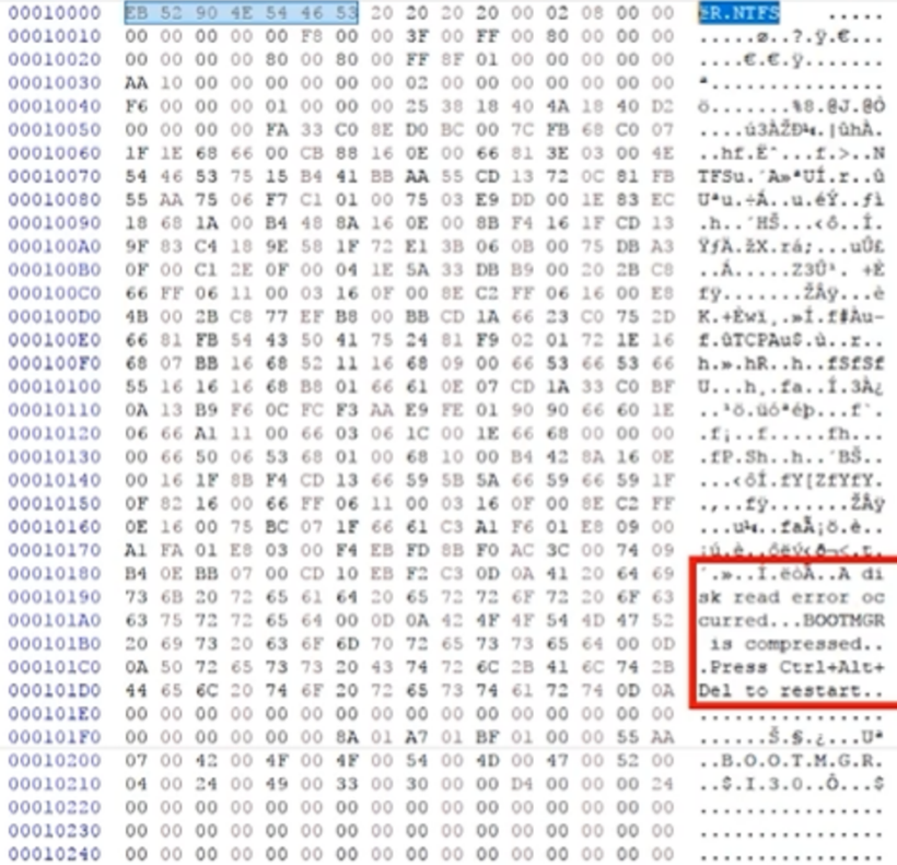 - 정상인 경우 eR.NTFS 문자열로 시작하며, 해당 섹터 후반부, disk read error occured라는 문자열이 존재, +1 Sector에 B.O.O.T.M.G.R 이라는 문자열이 반드시 출력됨
