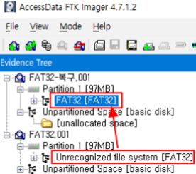 - FTK Imager에서 이미지를 불러온 후, 파일 시스템 종류와 상관 없이 파티션 접근이 되지 않거나, 일부 회복된 파티션이 확인되면 손상이 갔다는 의미이다.