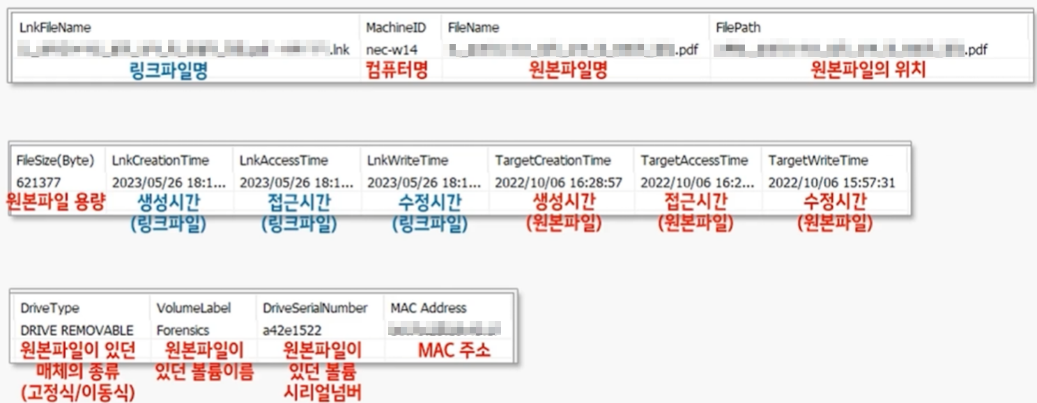 - 원본 파일과 .lnk 파일의 속성 정보를 다수 출력해 주며 특히 경로와 시간 정보는 분석에서 매우 유용하게 사용된다