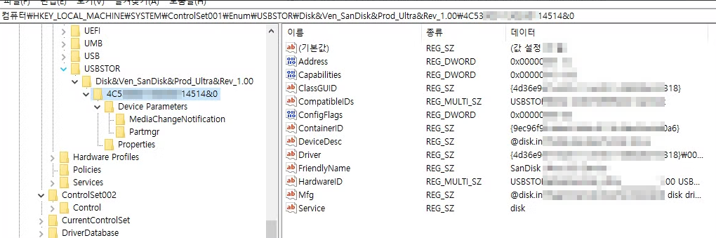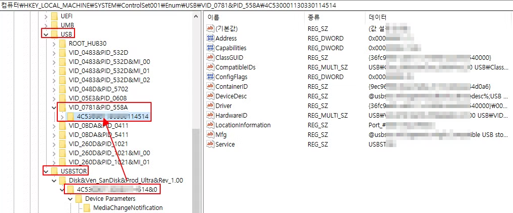 - 해당 레지스트리 정보는 USBSTOR과 경로도 동일하기 때문에 확인이 어렵지도 않다.