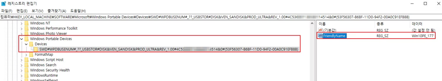| 레지스트리 경로 | (HKLM)HKEY_LOCAL_MACHINE\SOFTWARE\Microsoft\Windows Portable Devices\Devices |