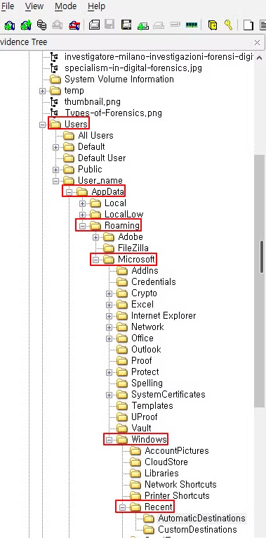 - 저장 경로는 '%UserProfile%\AppData\Roaming\Microsoft\Windows\Recent\'이며, 각각 AutomaticDestinations 및 CustomDestinations로 저장되어 있다
