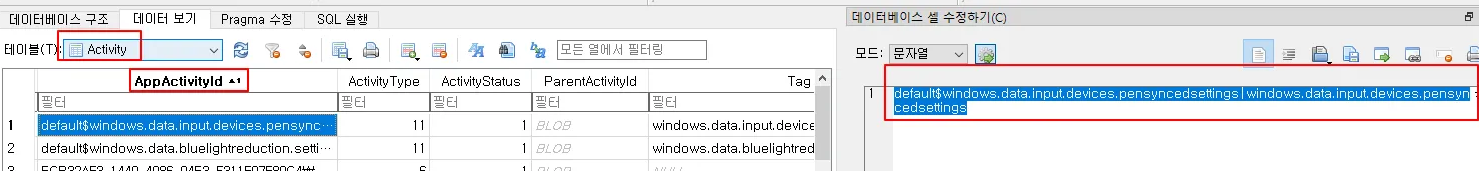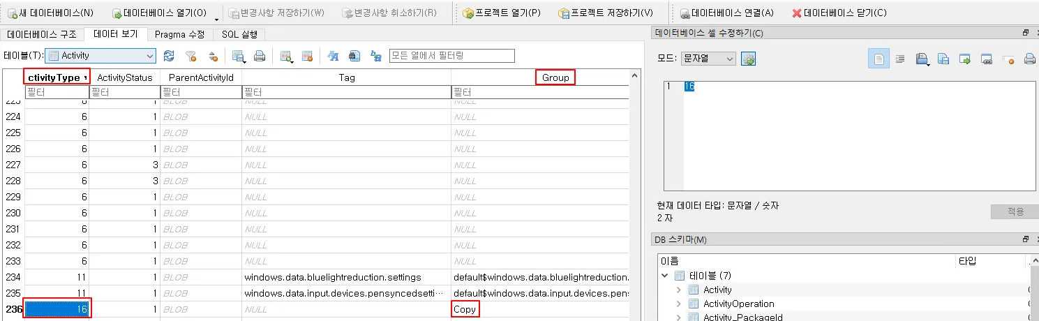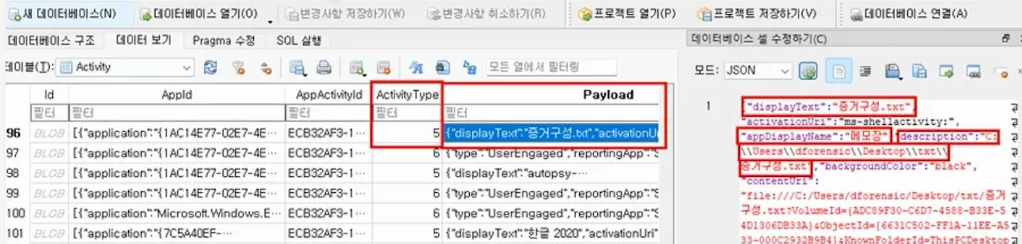 - 관련 로그로 ActivitiesCache.db라는 파일이 있으며, SQLite 포맷의 DB 파일이다