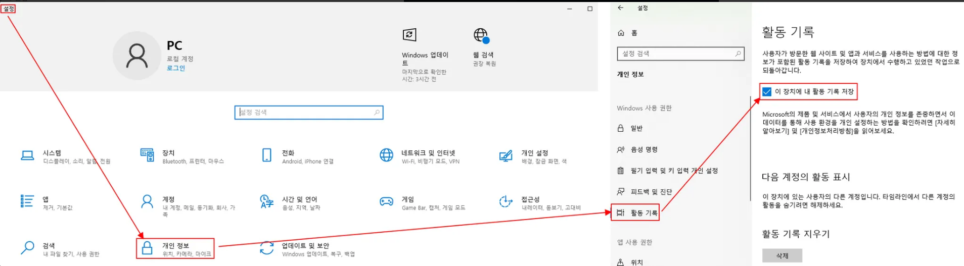 - 해당 기능의 활성화 여부는 [설정] → [개인정보] → [활동기록] -> '이 장치에 내 활동 기록 저장' 체크를 한다