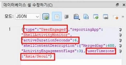 | Payload | * 실행한 응용 프로그램 및 파일에 대한 세부 정보를 기록 1) Activity Type 5인 경우 : 타임라인에 보여지는 정보 확인 ![]() - Displaytext : 열었던 파일명 또는 URL 주소 - appDisplayName : 응용 프로그램 이름 - Description : 열었던 파일 / URL의 전체 경로 / URL 2) Activity Type 6인 경우 : 실행한 응용프로그램 및 파일에 대한 세부 정보를 기록 ![]() - Type : 활동 유형 - activeDurationSeconds : 활동 지속 시간(초) - userTimezone : 타임존 정보 |