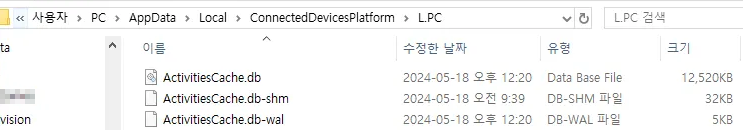 - ex) …\AppData\Local\ConnectedDevicesPlatform\a1b2c3d4e5f6h8\ActivitiesCache.db