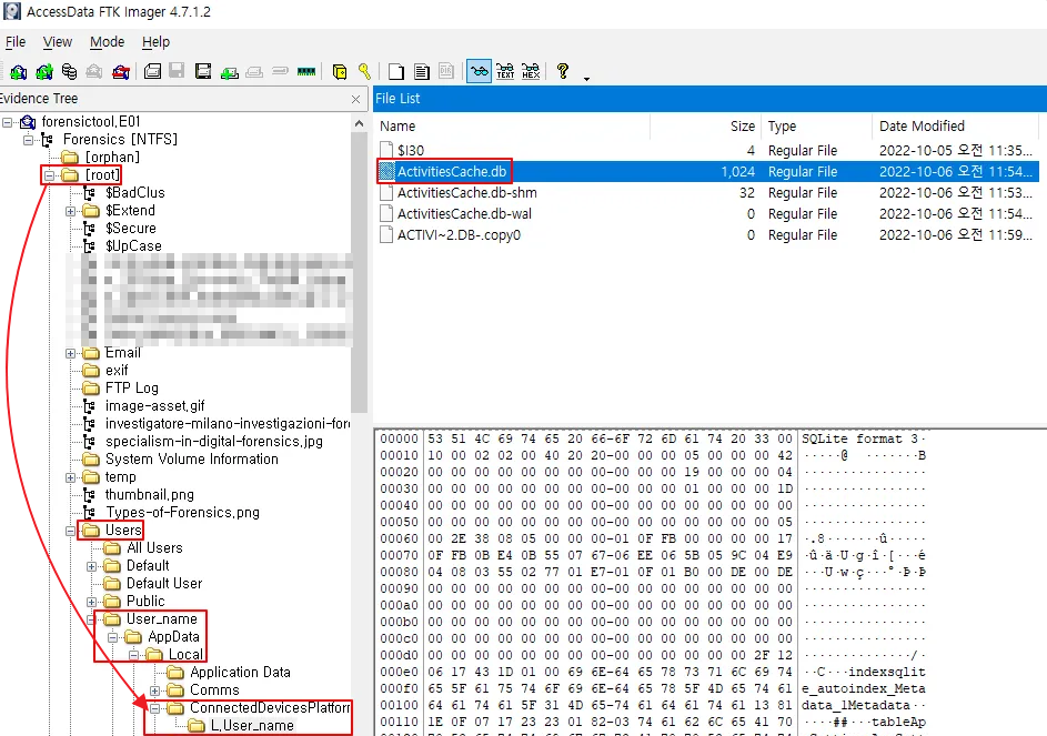 1) 포렌식 소프트웨어에서 해당 경로의 ActivitiesCache.db 파일 추출