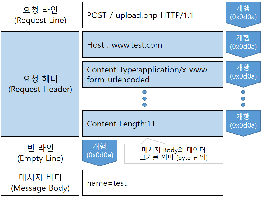 - [요청 라인 / 요청 헤더 / 빈 라인 / 메세지 바디]는 CRLF(Carriage Return : 행의 맨 앞으로 이동, Line Feed : 다음 행으로 이동)를 통해 개행처리 되어 각 영역을 구분