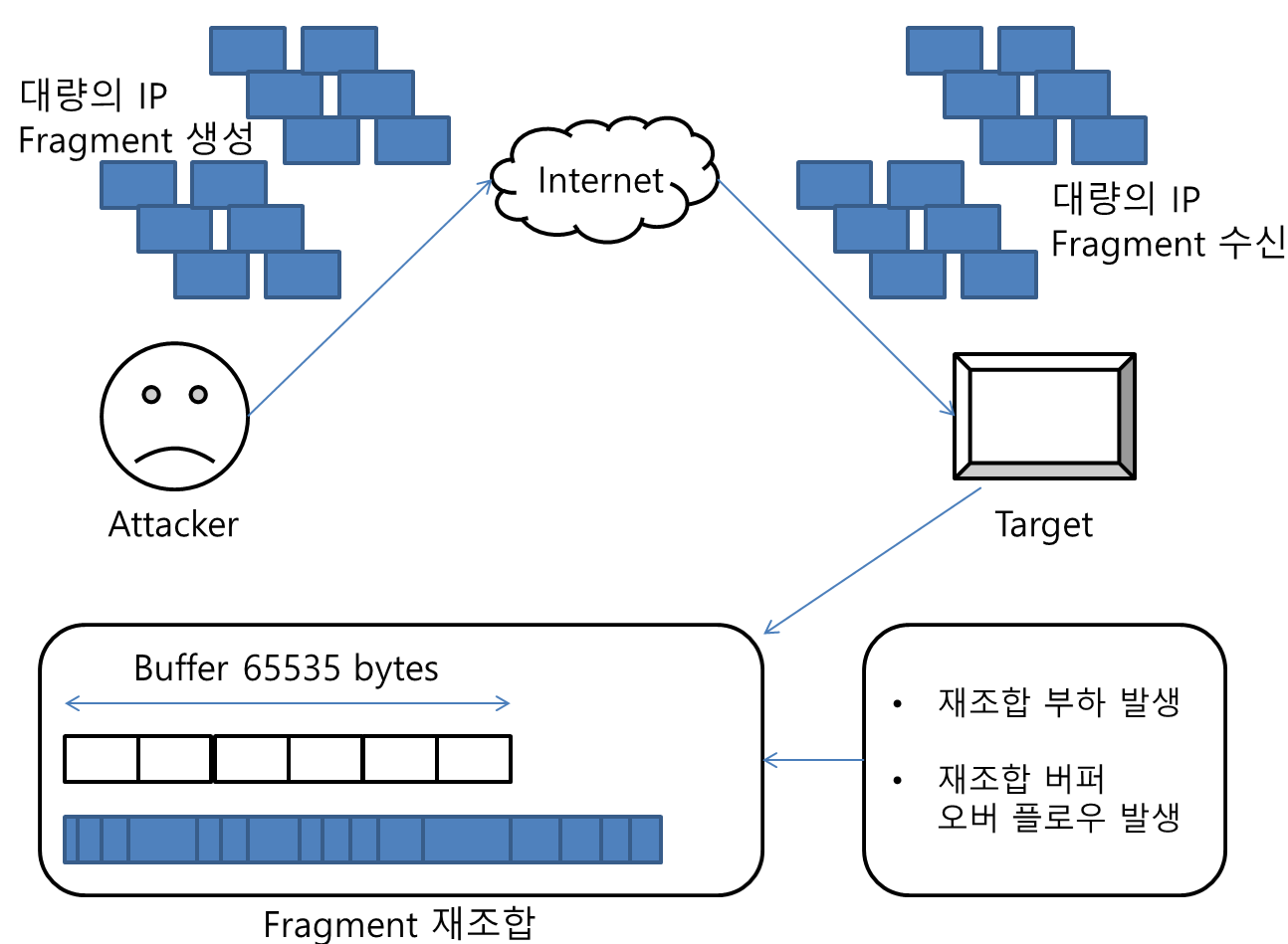 1) Ping Of Death Attack : ICMP 패킷(Ping)을 정상 크기보다 아주 크게 만들어 전송, MTU에 의해 다수 IP 단편화(Fragment)가 발생, 수신측에서 이를 재조합(reassembling) 하는 과정에서 부하 또는 재조합 버퍼 오버플로우를 유발