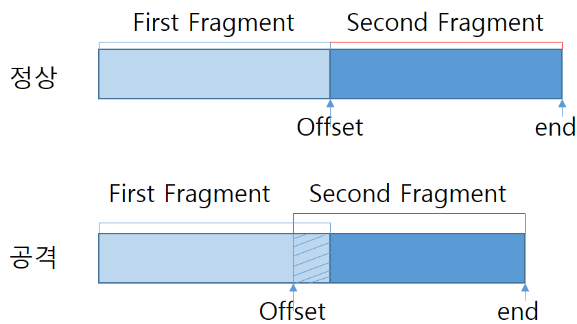 - Fragment Overlap : IP Fragment의 offset값을 조작하여, 서비스 포트 필드를 중첩시켜 재조합이 되고 나면, F/W에서 허용하지 않은 서비스에 접근 가능 (DoS가 아닌 우회 공격 기법)