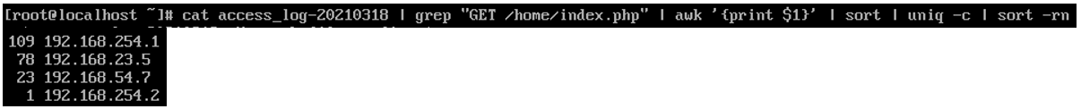 - awk '{print $1}' : grep한 행 중에서 첫 번째 컬럼($1 - 요청 클라이언트 IP)을 출력(print)
