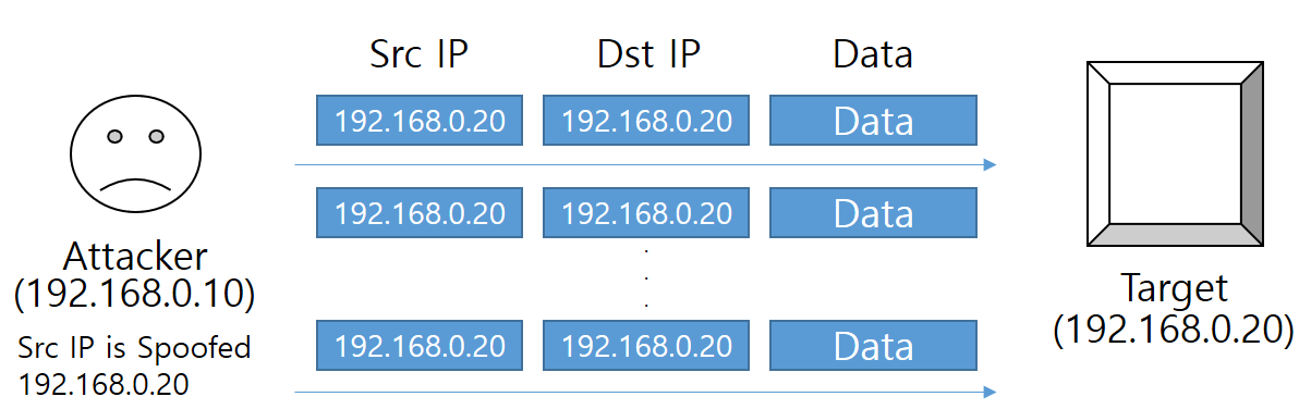 - 대응책 : 대부분 OS 및 방화벽에서 출발지와 목적지 IP가 동일한 패킷은 모두 Drop하기 때문에, 현재는 이론상 존재하는 공격 기법