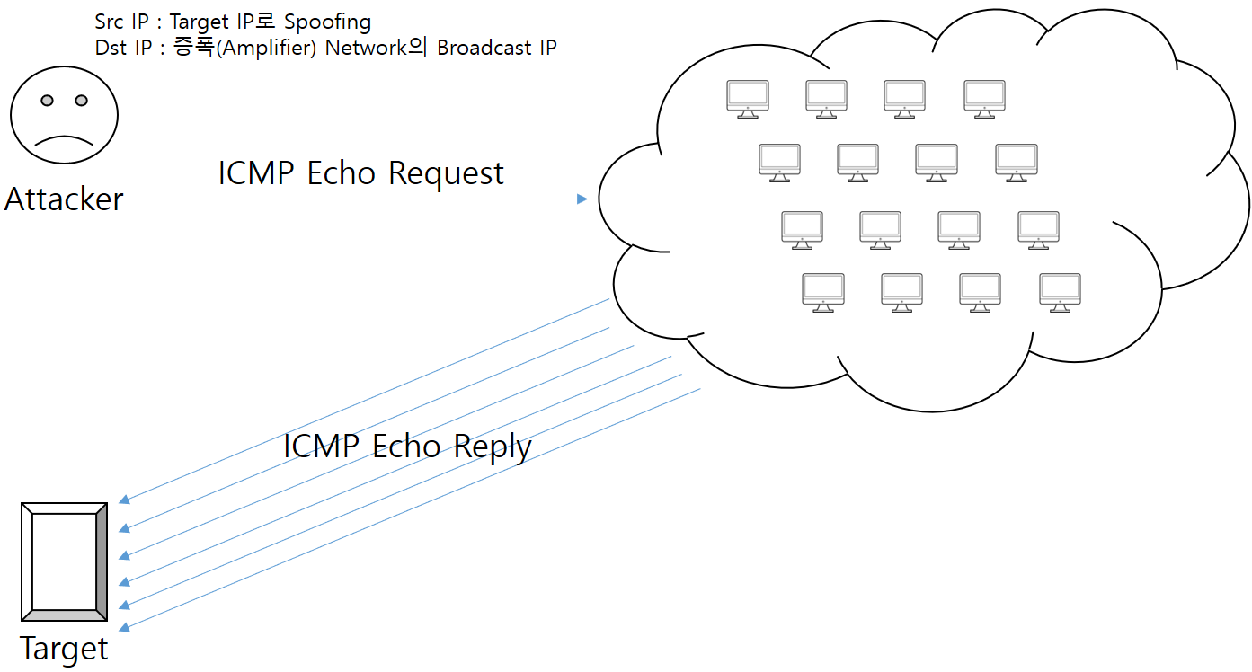 3) Smurf Attack : 출발지 IP를 Target의 IP로 위조(IP Spoofing) 후, 증폭(Amplifier) Network로 ICMP Echo Request를 Boradcast하여, 다수의 ICMP Echo Reply가 Target으로 전달되게 하는 방식