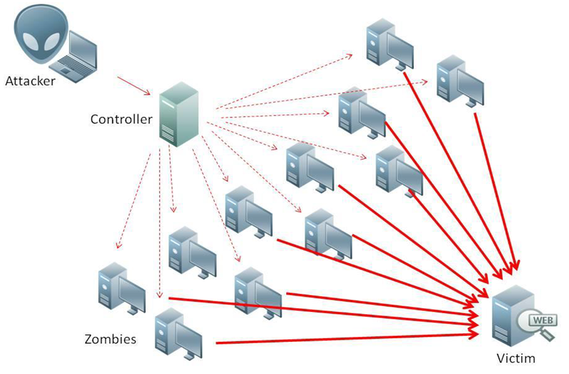 - 보통 악성코드에 감염되어 C&C (Command & Control) 서버를 통해 다수 대상에서 공격을 수행