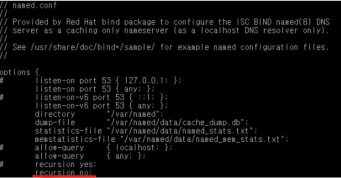 | 재귀적 질의 제한 | * Recursive Query 악용 방지를 위한 접근제어 적용 (기본 설정은 모든 IP의 재귀적 질의 허용) - 재귀적 질의 불허 : options 설정 내에 recursion no; 설정 - options 설정 내 allow-recursion 설정으로, 특정 IP 또는 대역 명시로 제한적 질의 허용 ex) allow-recursion {127.0.0.1;192.168.10.0/24}; 및 allow-recursion {internal;}; 설정 후 options 외부에 acl internal { 127.0.0.1; 192.168.10.0/24}; 설정 - Recursive Query에 대한 불허 또는 ACL deny에 해당하는 IP의 경우, nslookup으로 IP또는 Domain을 조회 하더라도, Can't find가 반환되어 질의가 제한됨 |