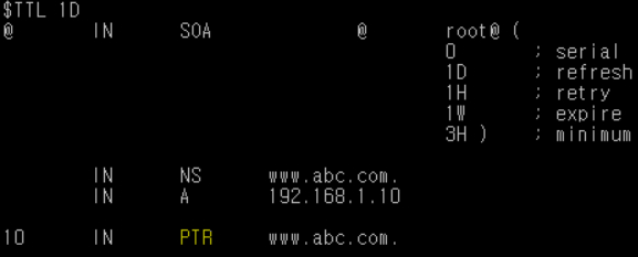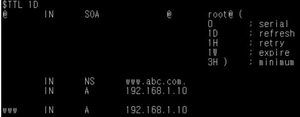 | TTL | * 레코드의 TTL값을 지정 (미 지정시, Default 값(첫 행의 $TTL 만큼 적용 받음) |