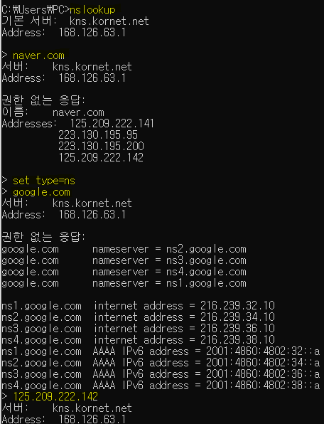 2) nslookup 명령어 : 명령 실행 후 대화형 모드로 질의