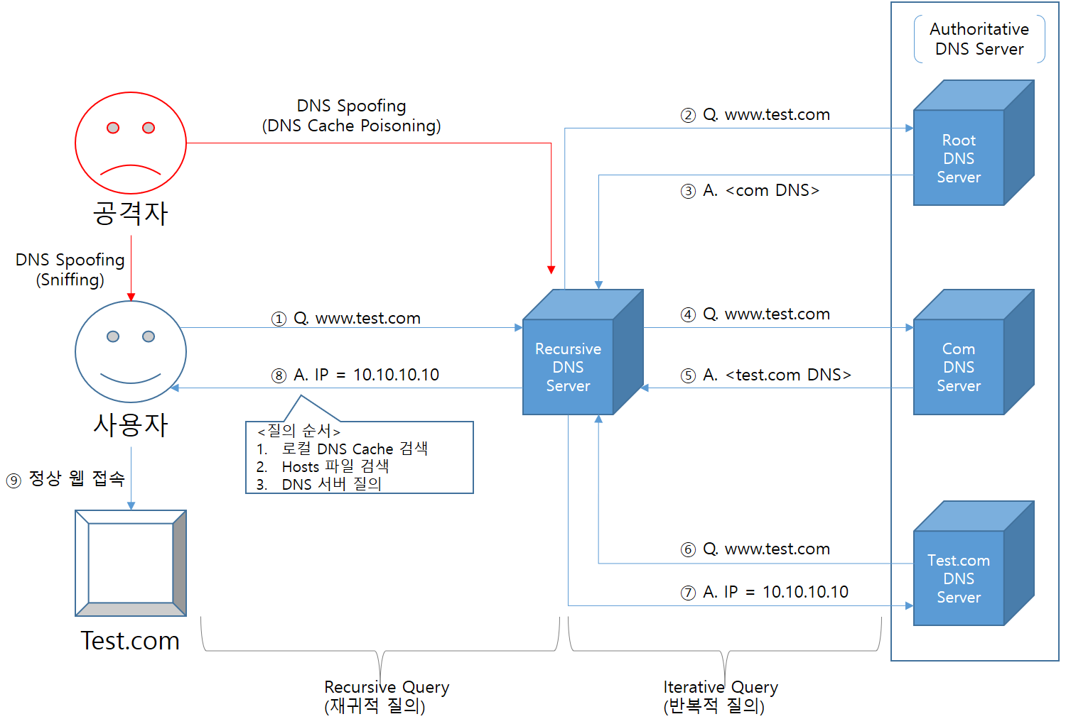 | Iterative Query | * Recursive DNS Server가 도메인을 관리하는 각각의 Authritative DNS Server로 질의할 때 사용하는 순차적 반복질의 |