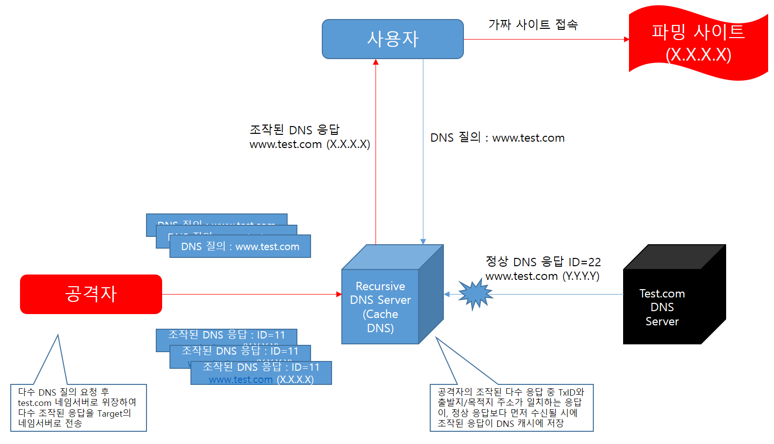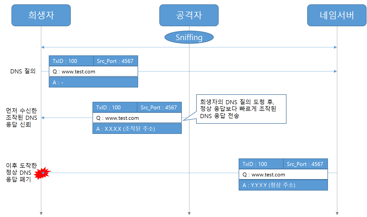 - 공격자가 공격 대상의 DNS 서버에 조작할 DNS Query를 다수 발생시키는 동안, 다수의 DNS 응답(스니핑이 불가능 할 시, 랜덤한 Transaction ID와 목적지 Port)을 보내 그 중, 정상 응답보다 먼저 일치하는 응답이 있다면, 조작된 주소 정보가 Target DNS Server의 Cache에 저장됨