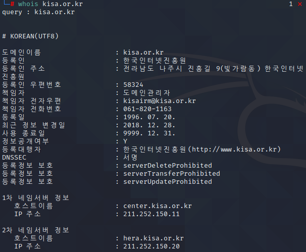 4) whois 명령어 : whois 서버를 통하여, 해당 도메인의 등록 정보(소유정보), 네트워크 할당 정보 등을 조회