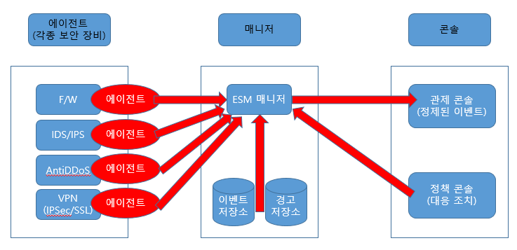 * ESM : 기업 내 각종 보안제품의 인터페이스를 표준화, 각종 이벤트를 수집, 관리, 분석, 통보, 대응을 통한