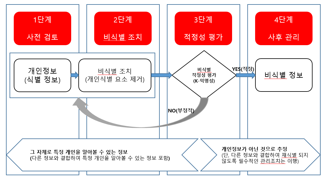 | 3단계 : 적정성 평가 | 다른정보와 쉽게 결합하여 식별 가능한지 여부를 평가 |